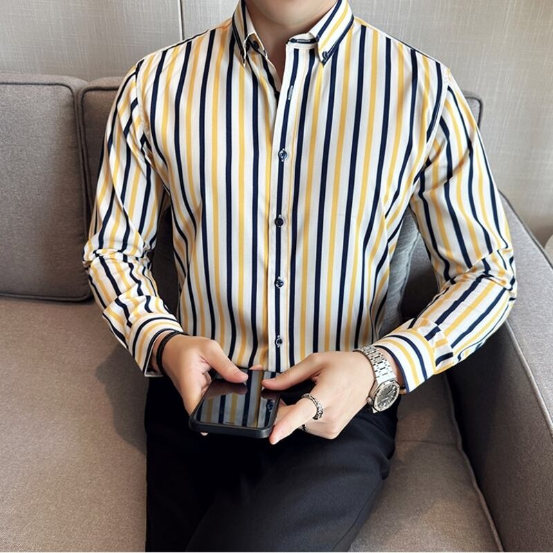 洗練されたストライプ柄が魅力のロングスリーブシャツ。