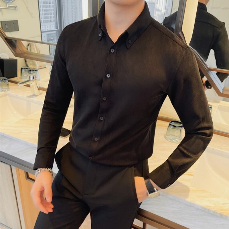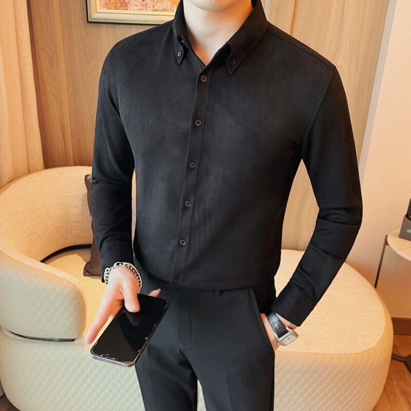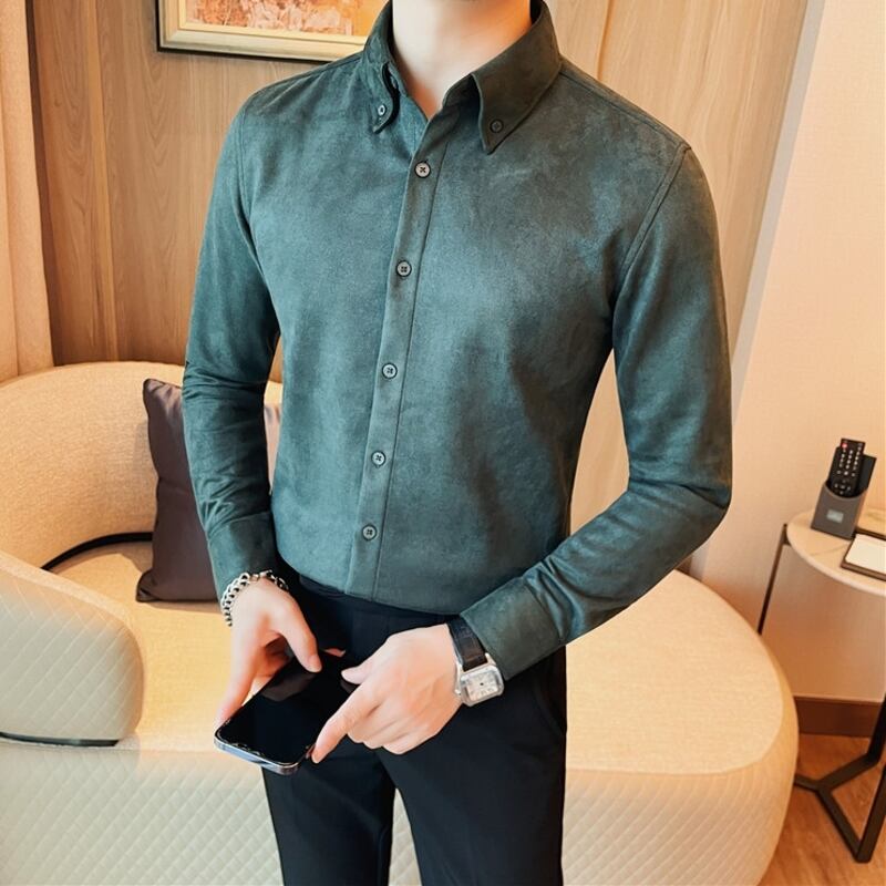 ロングスリーブのボタンダウンシャツは、上品な印象を与えるスエード調の素材で仕立てられています。