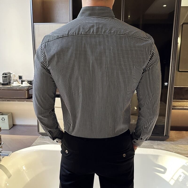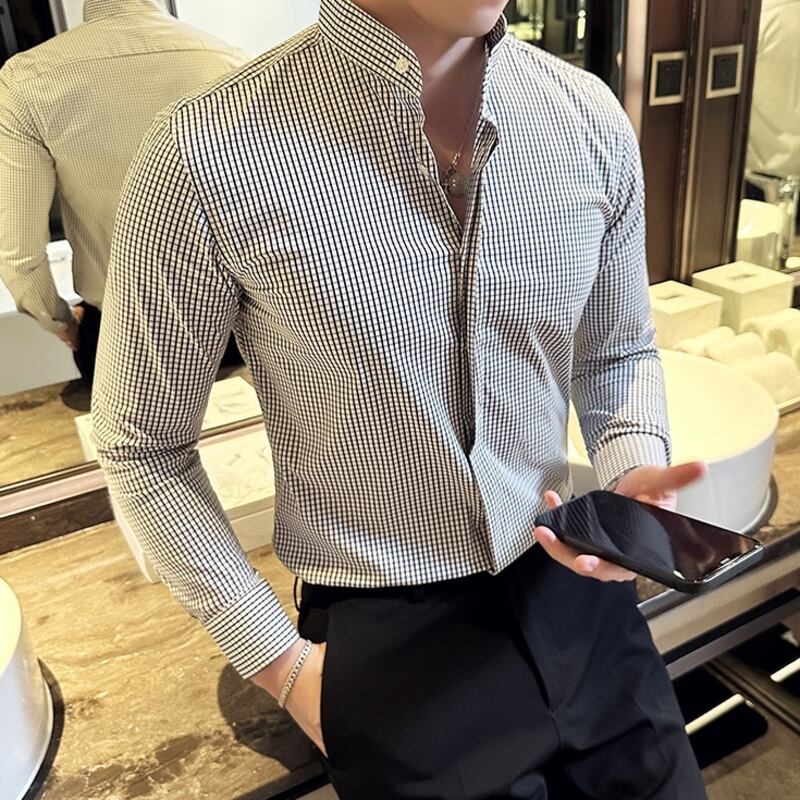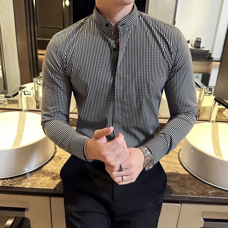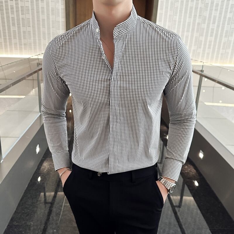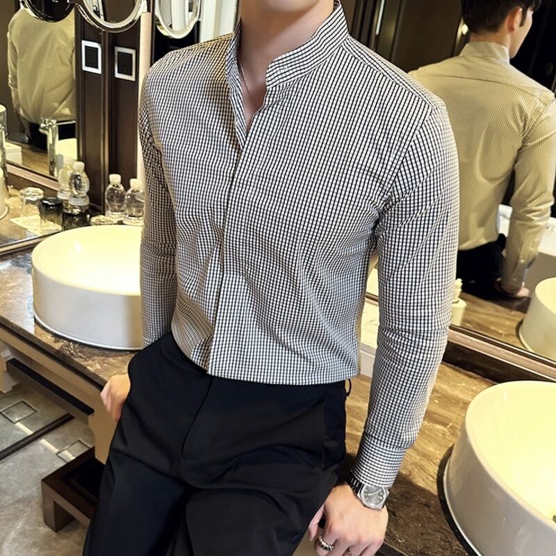 洗練された印象を与えるスタンドカラーのロングスリーブシャツ。