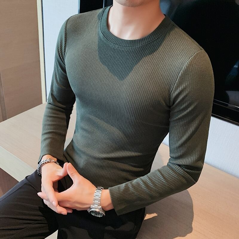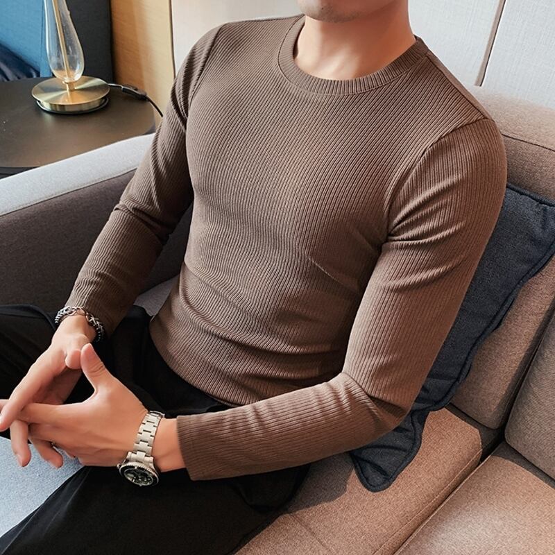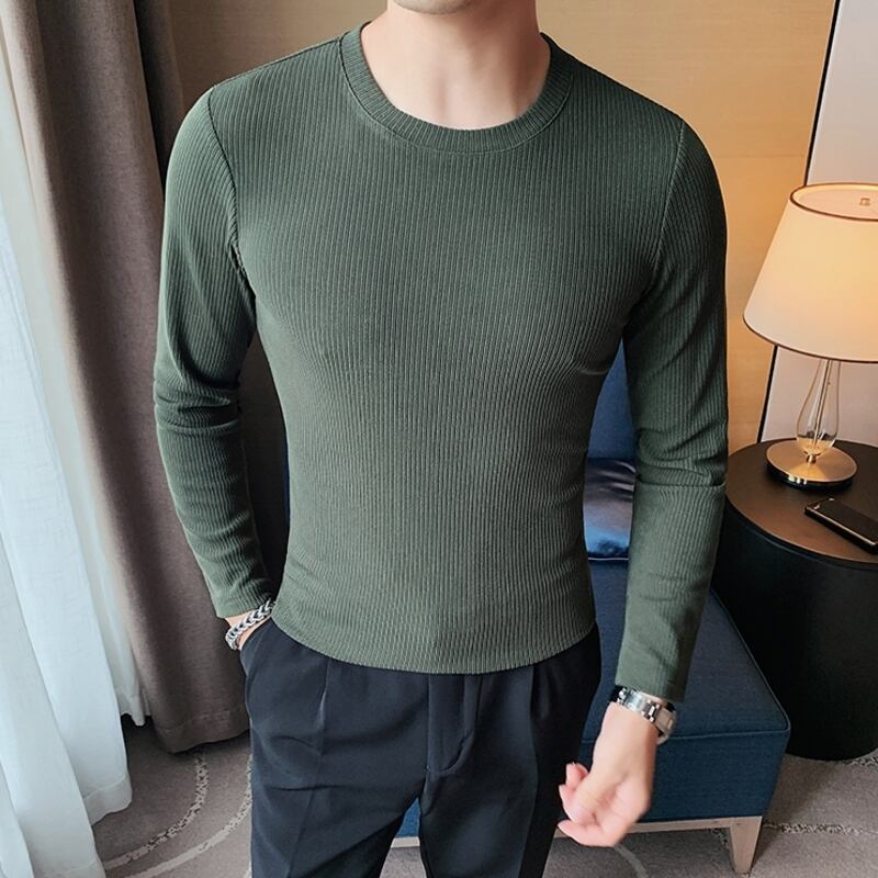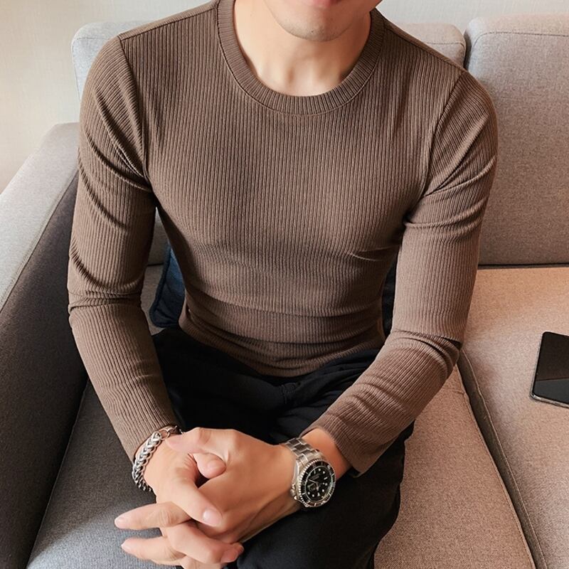 クルーネックの長袖リブニットTシャツは、着心地の良さとシンプルなデザインが魅力です。
