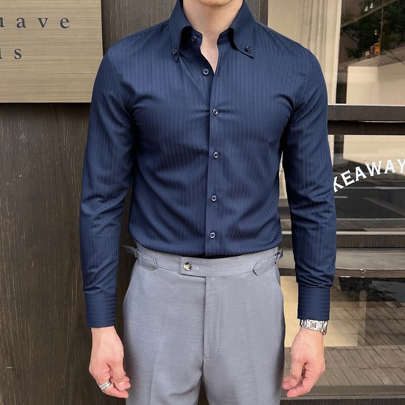 細かなストライプが洗練された印象を与え、着こなしを格上げ。