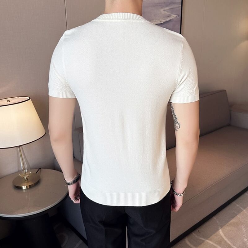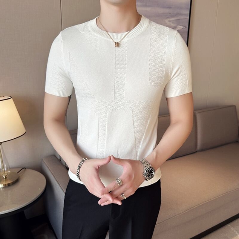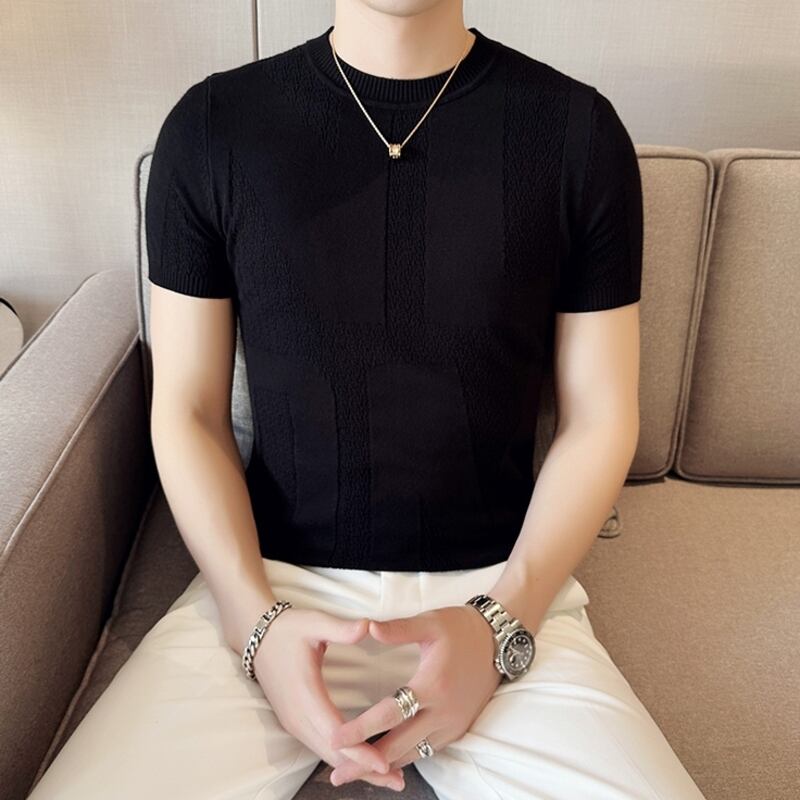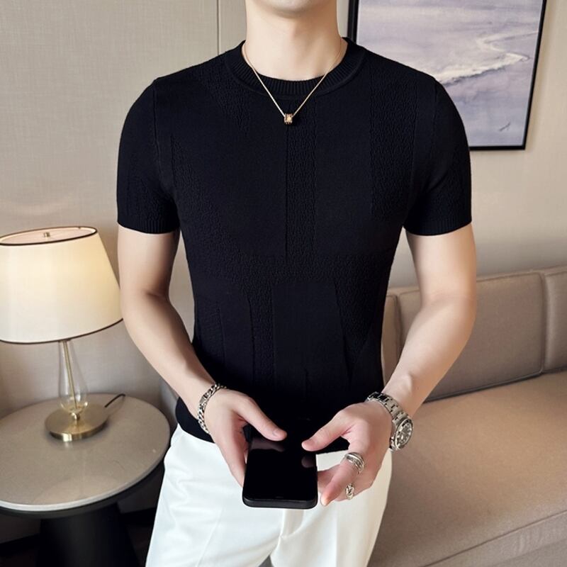 幾何学模様が洗練された印象を与える半袖ニットTシャツ。