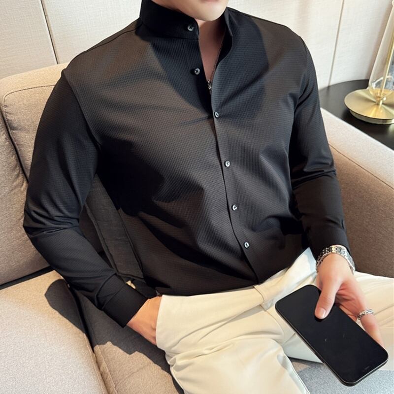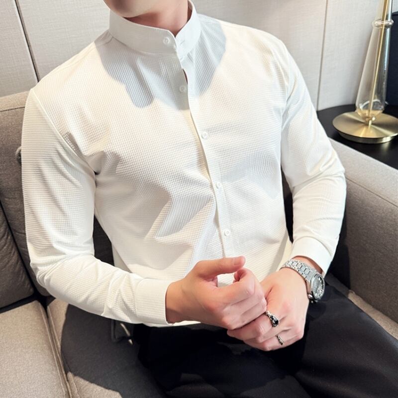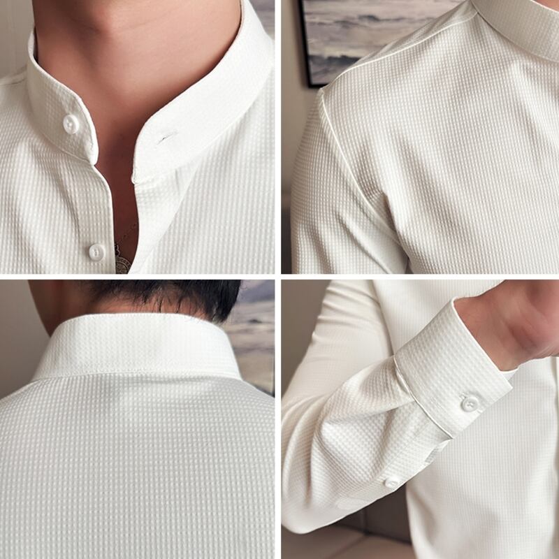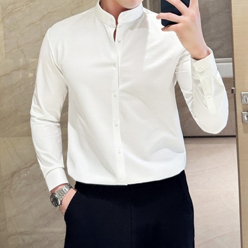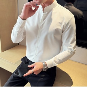 スタンドカラーの長袖シャツは、落ち着いた雰囲気を演出します。