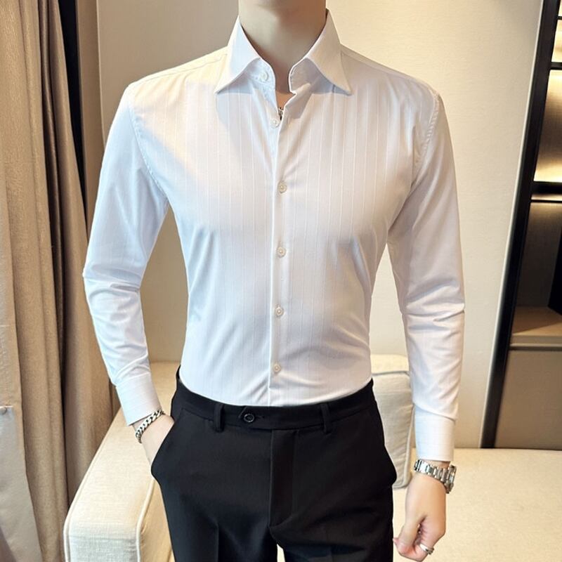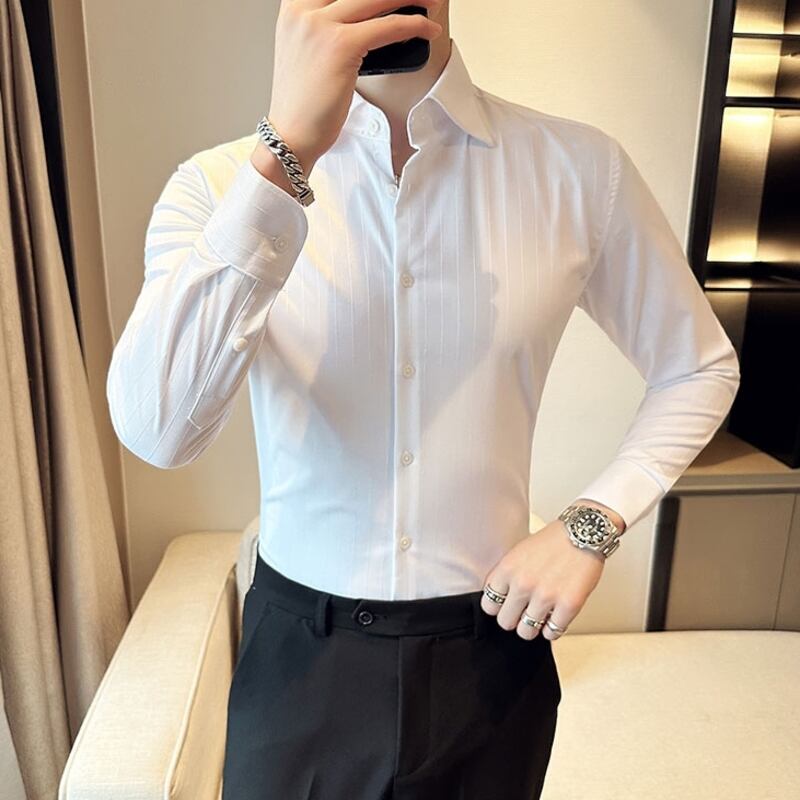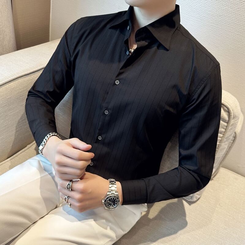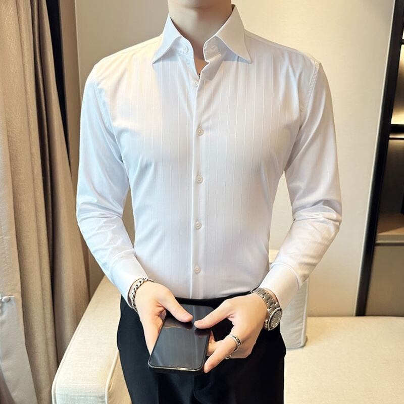 洗練された印象を与え、どんなシーンにも対応できるストライプ柄長袖シャツ。