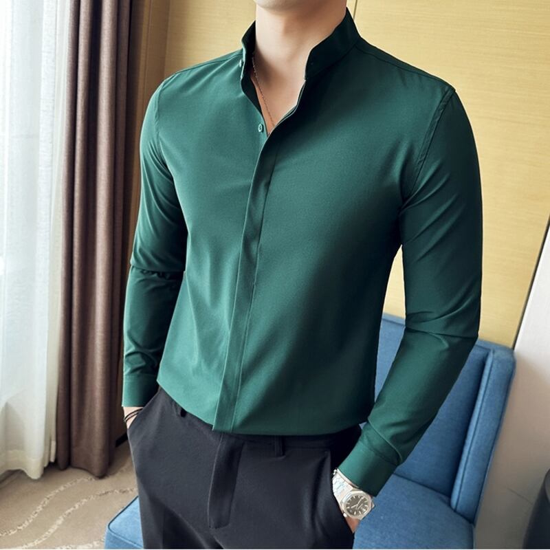 すっきりとしたスタンドカラーとシンプルなデザインが魅力の長袖シャツ。