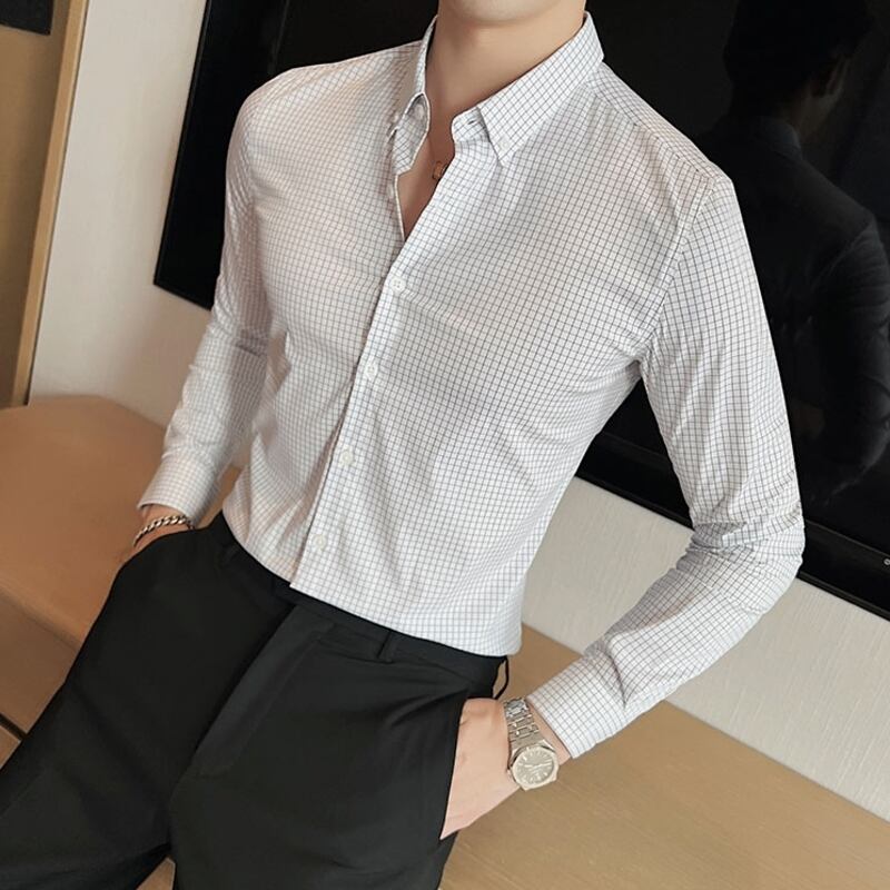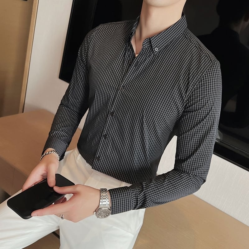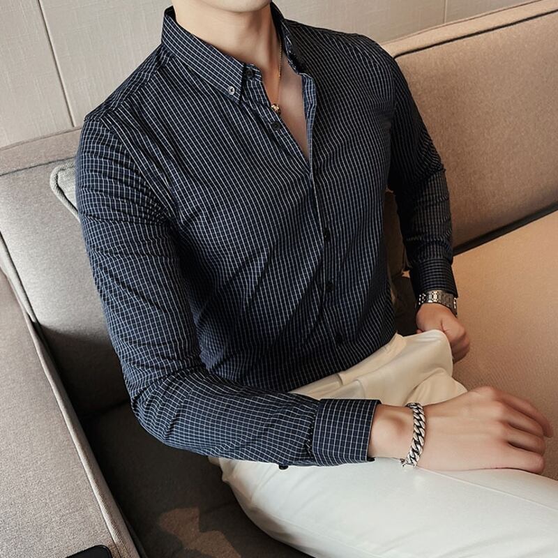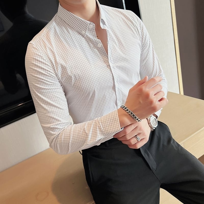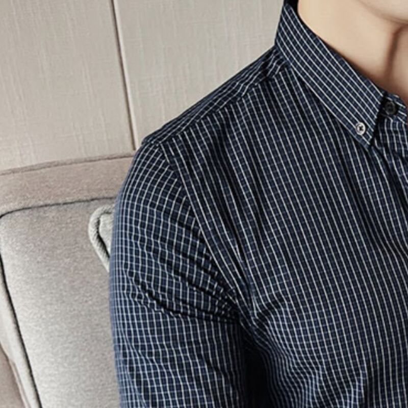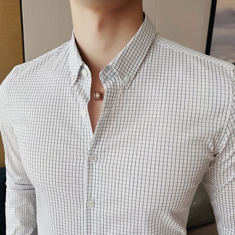 洗練された格子柄が魅力の長袖ボタンダウンシャツ。