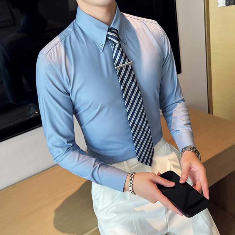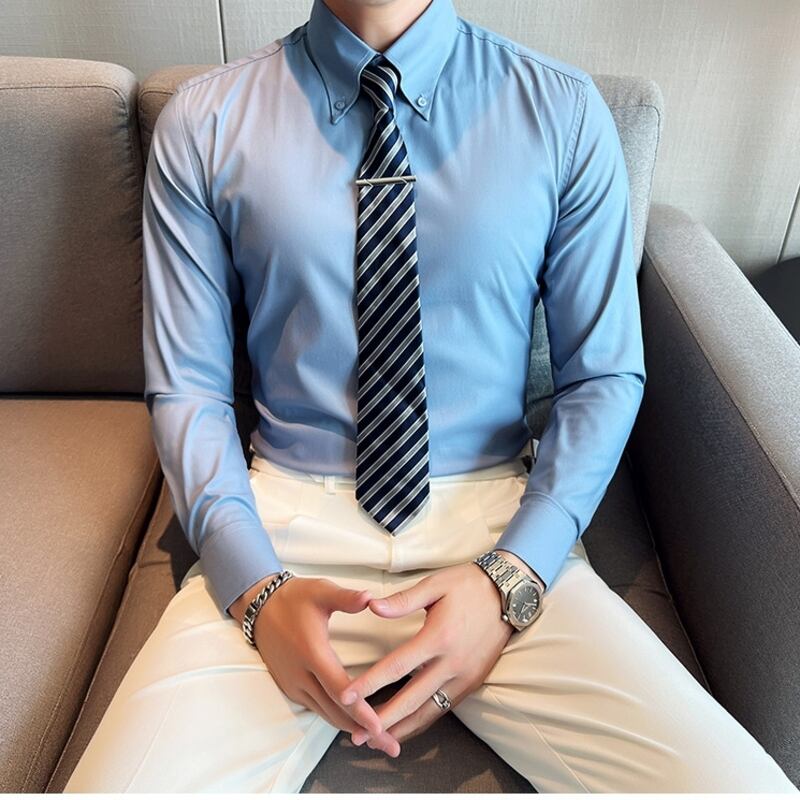 ボタンダウンカラーとカフス付きのデザインで、ビジネスシーンにも最適です。