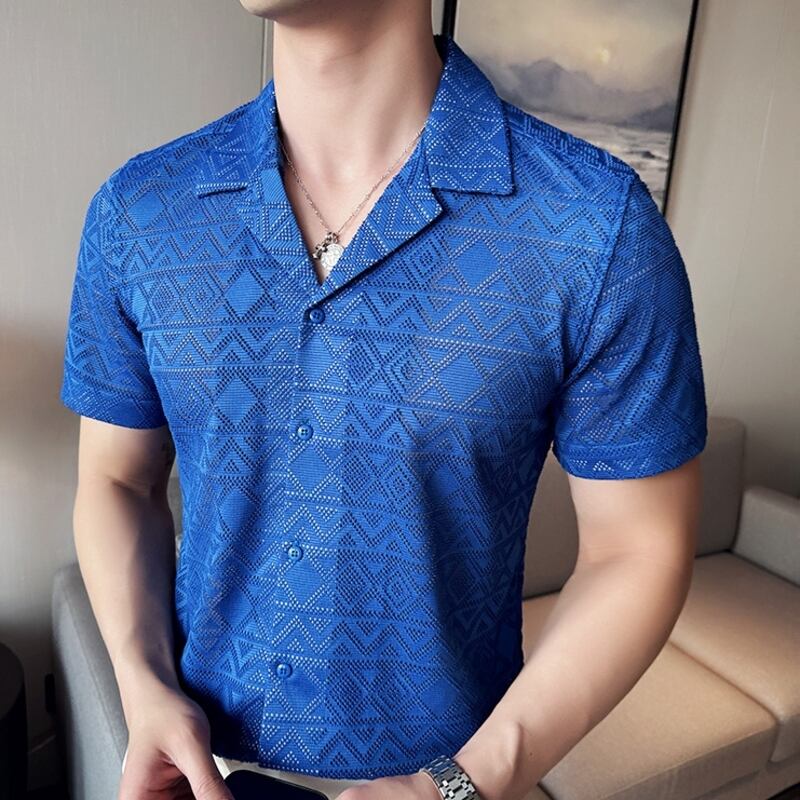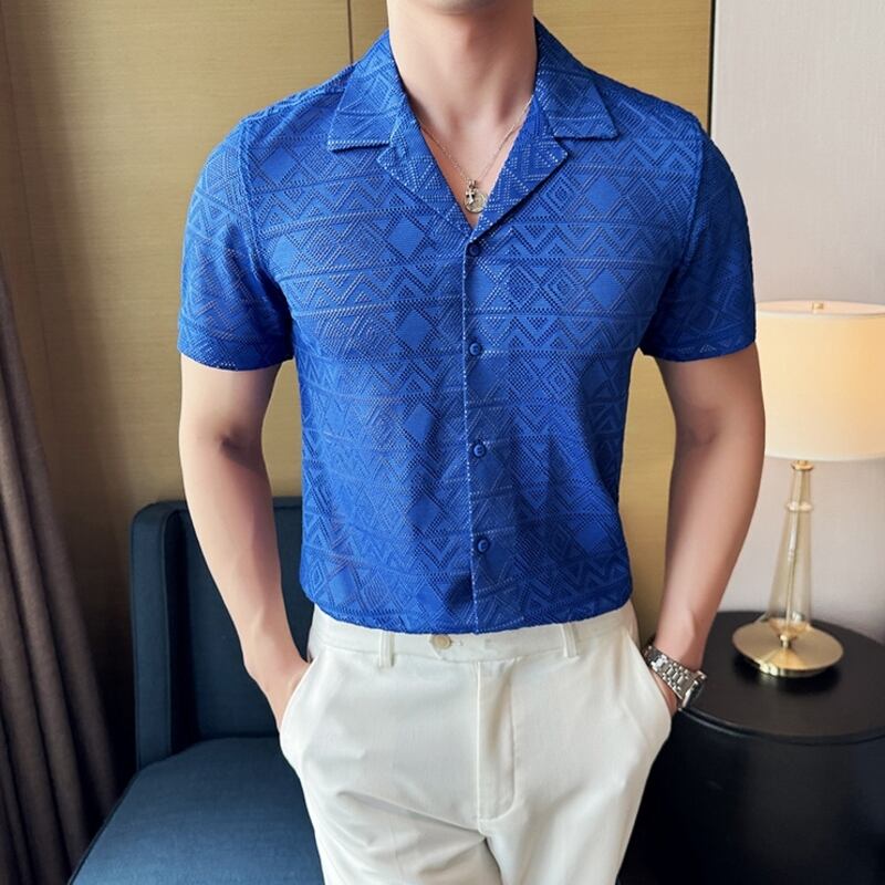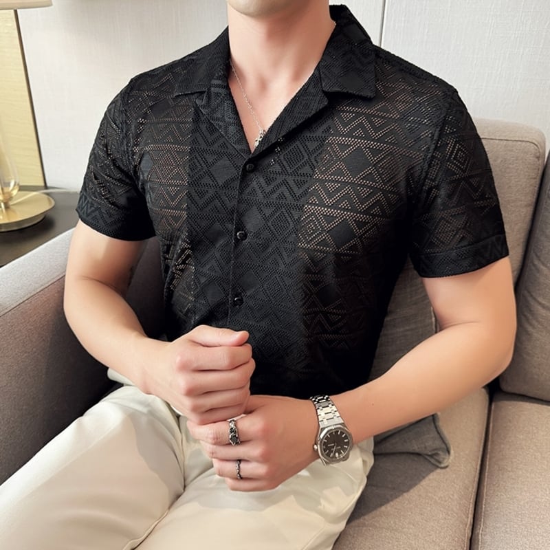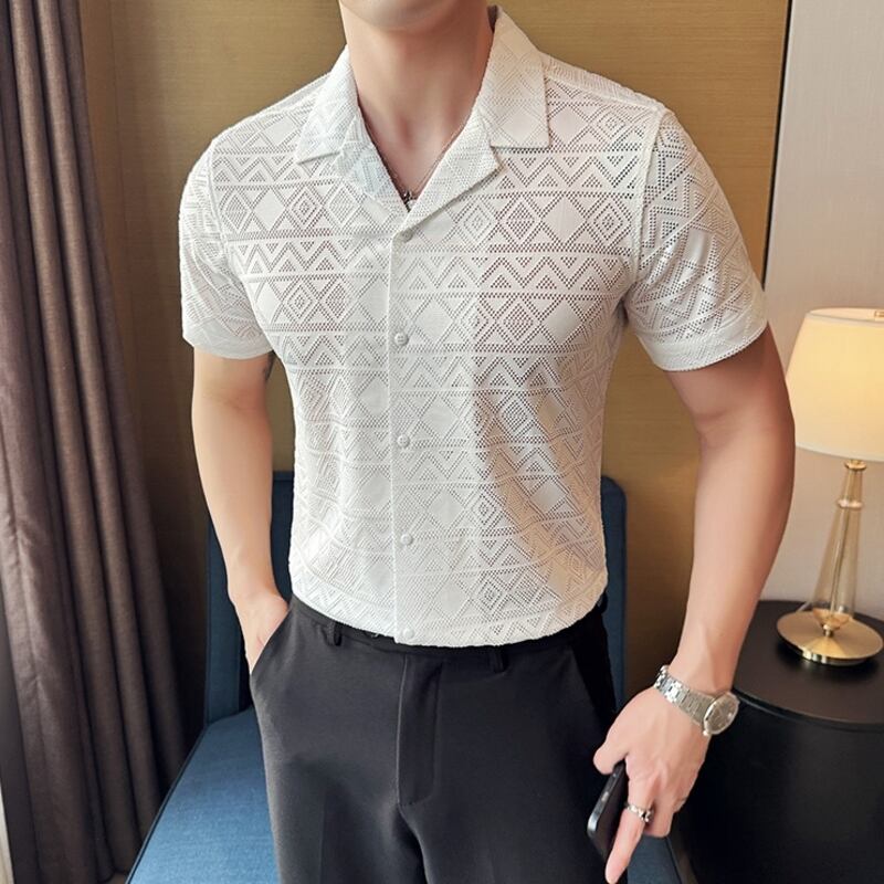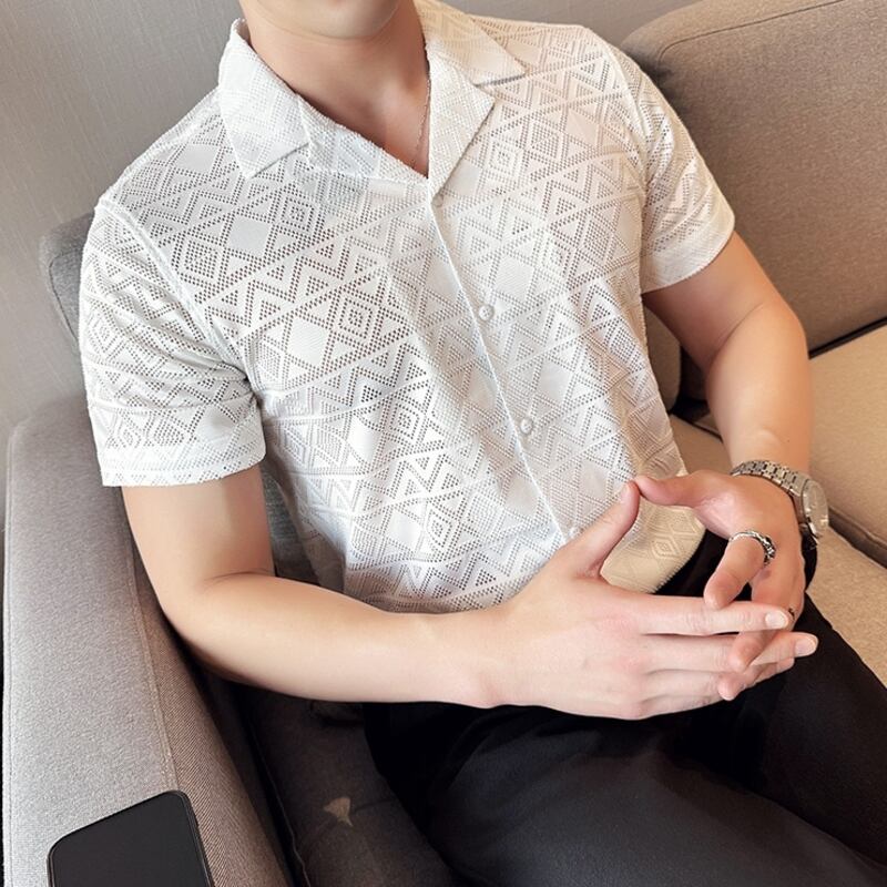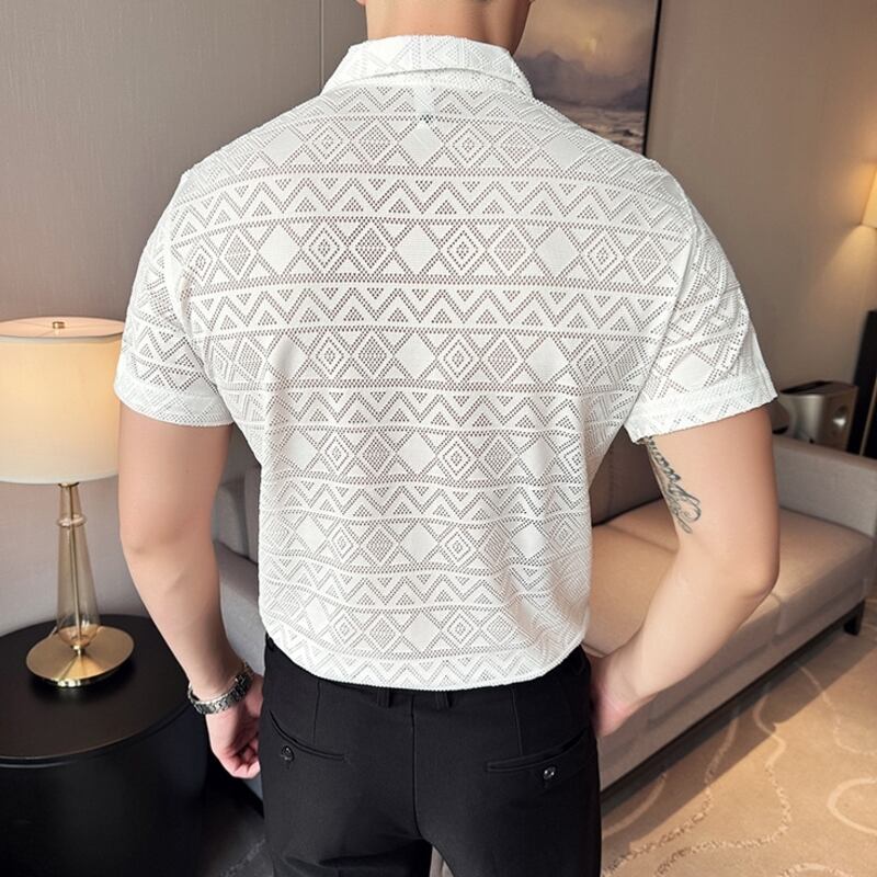 幾何学模様の透かし編みがあしらわれたオープンカラーシャツは、夏のコーディネートに軽やかさと洗練さをプラスします。
