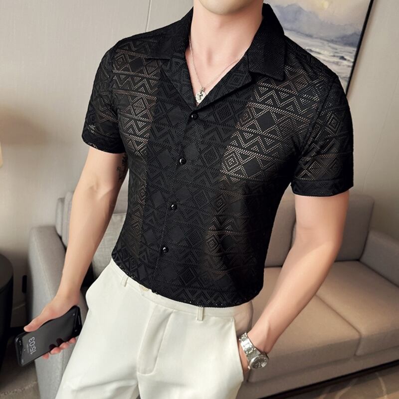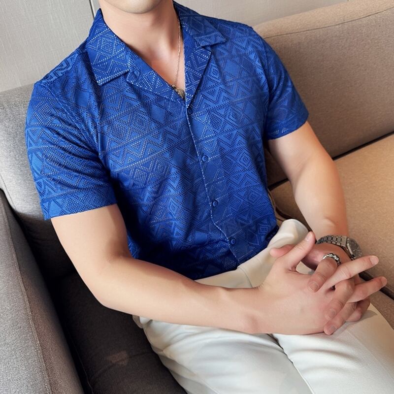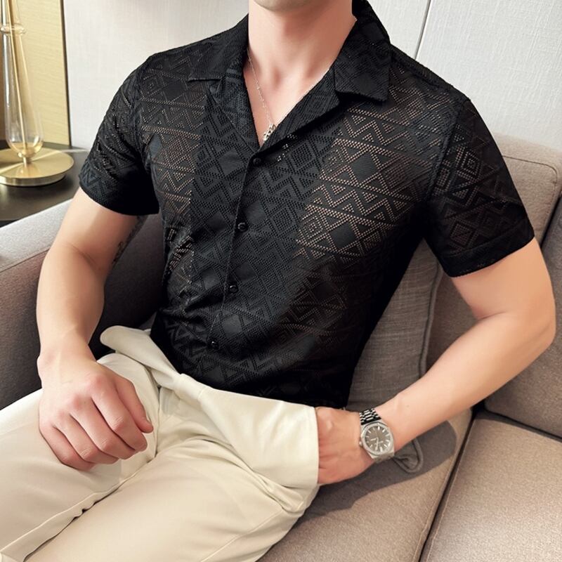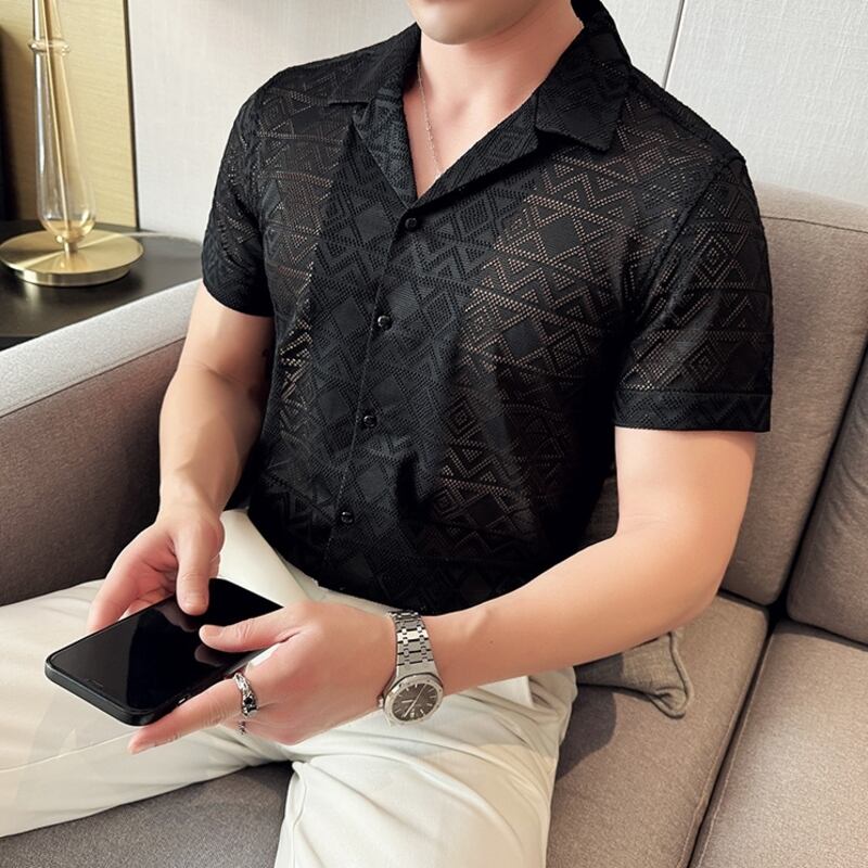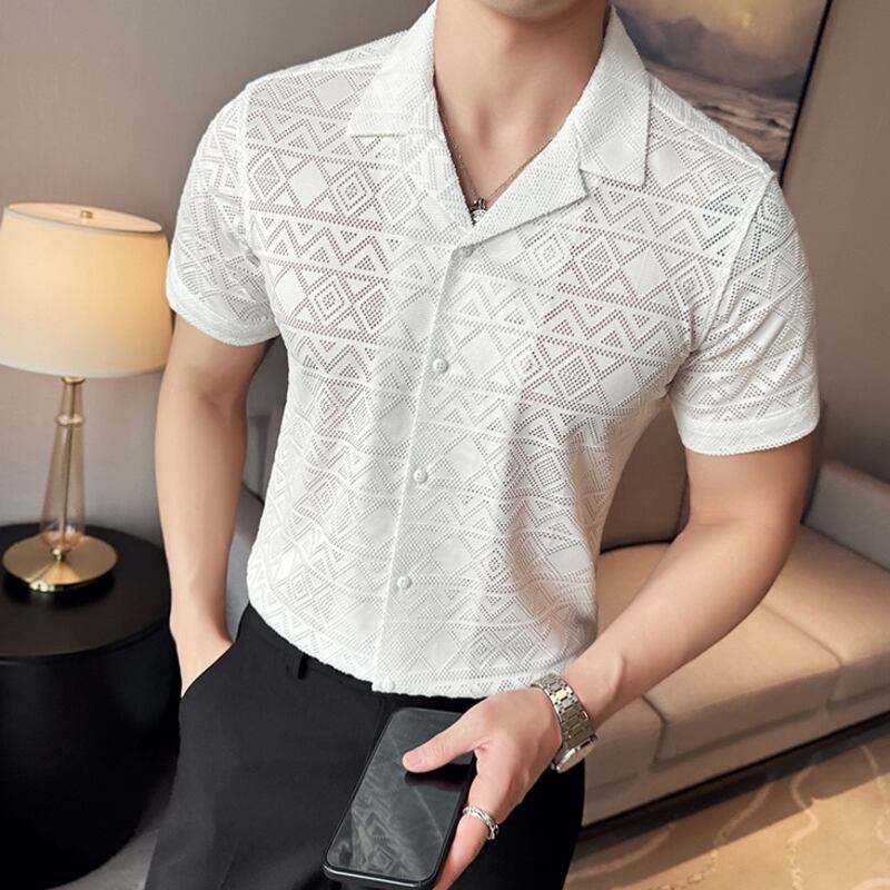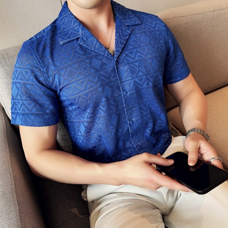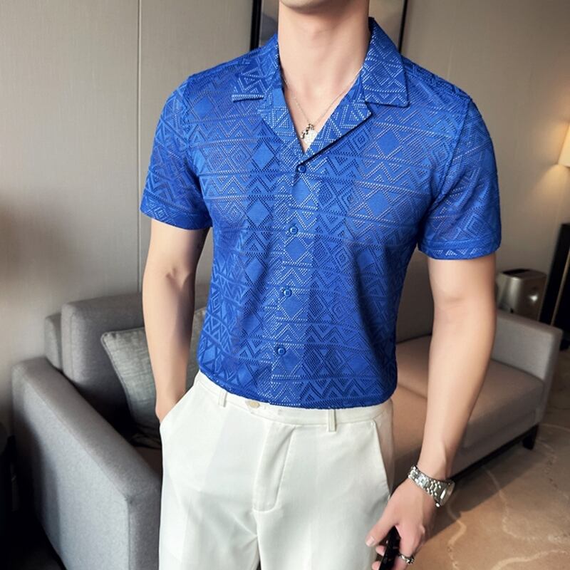 幾何学模様の透かし編みがあしらわれたオープンカラーシャツは、夏のコーディネートに軽やかさと洗練さをプラスします。