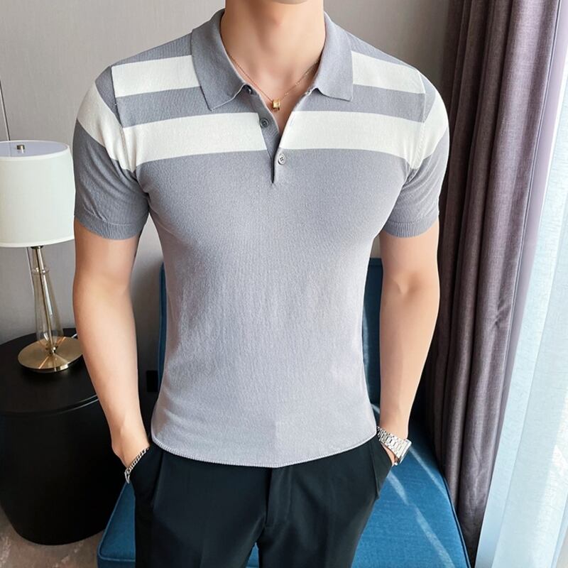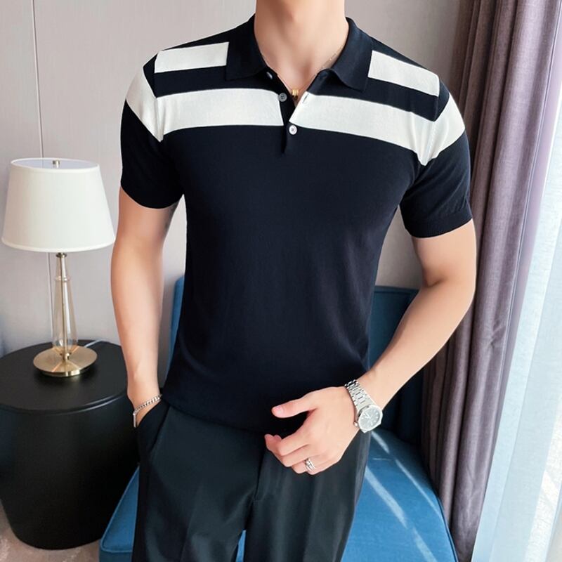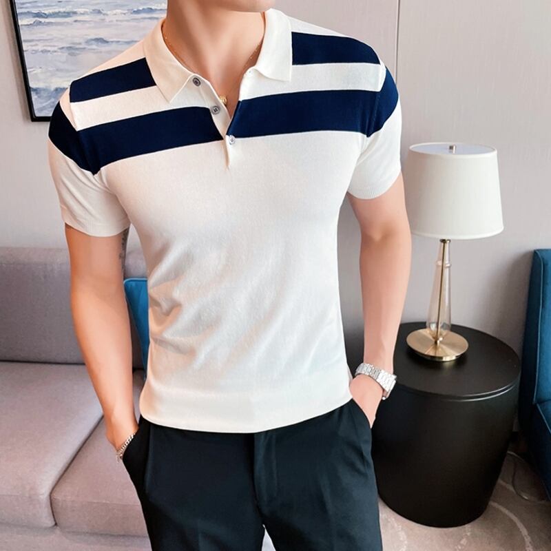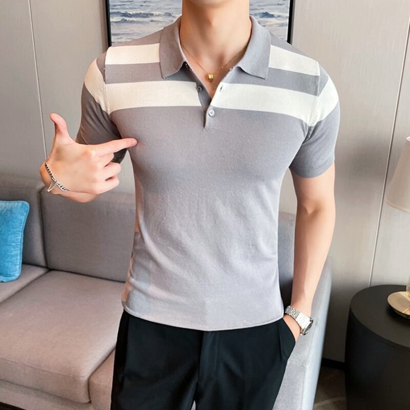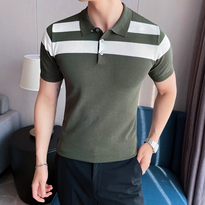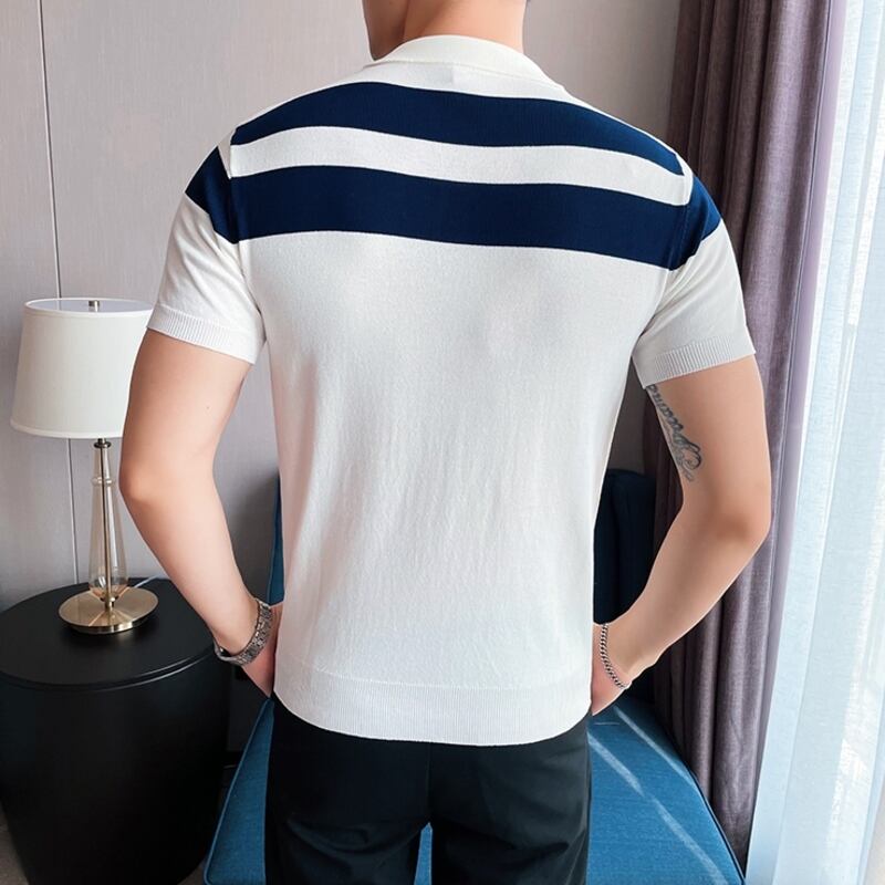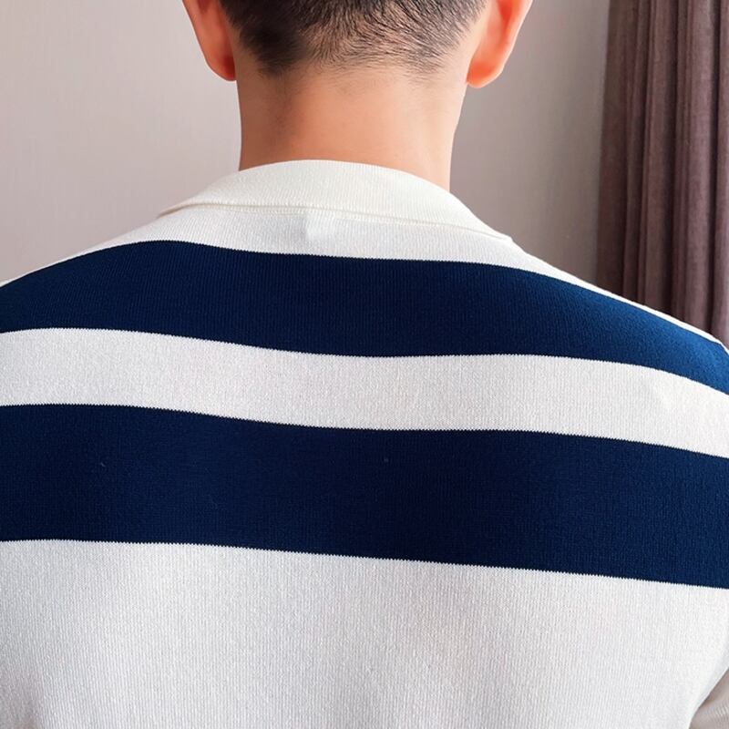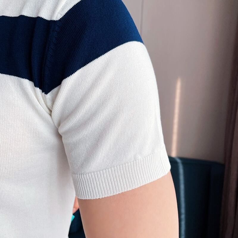 洗練されたボーダーデザインが魅力のショートスリーブニットポロシャツ。
