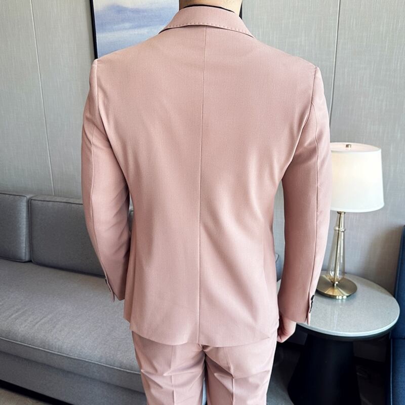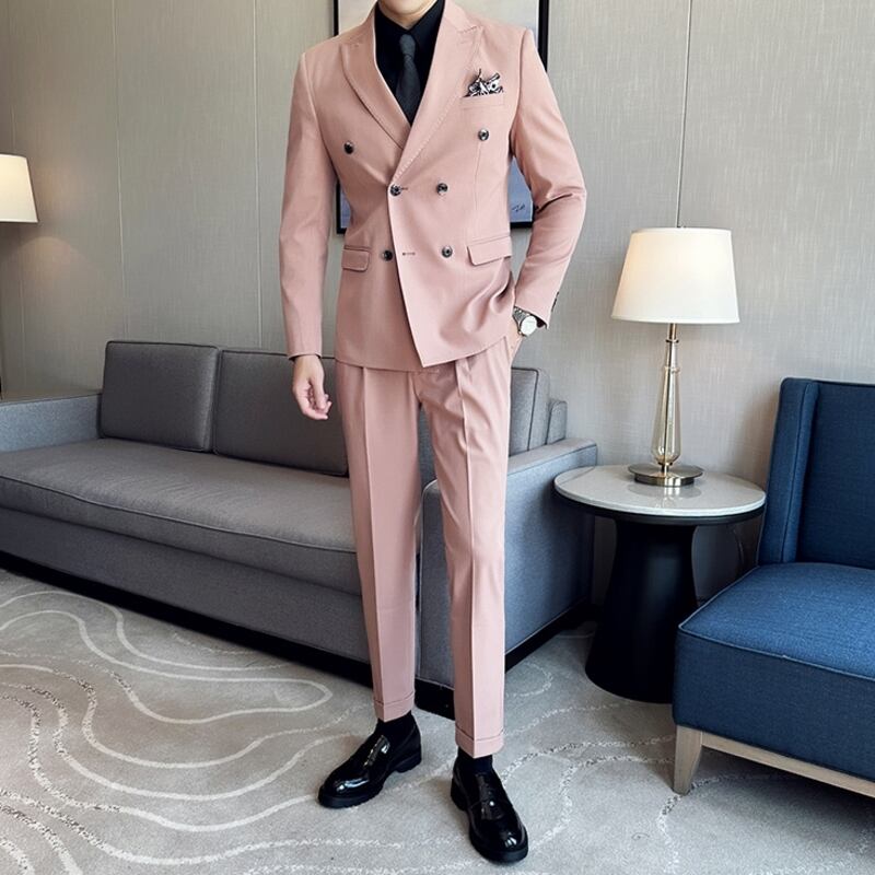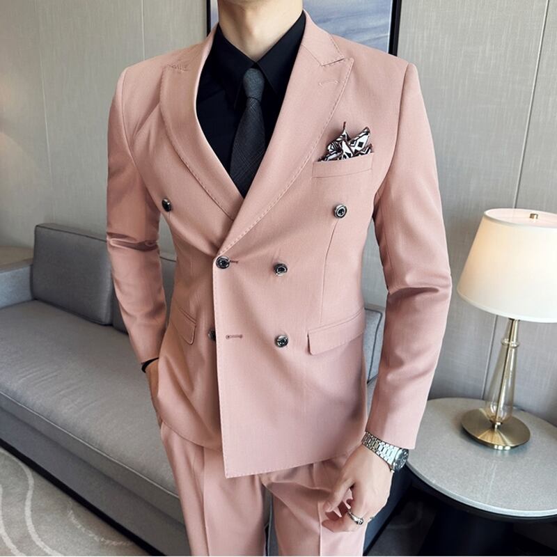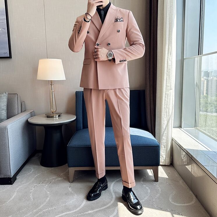 ステッチの質感が美しい、ダブルブレストのスリムフィットスーツ3点セットです。
