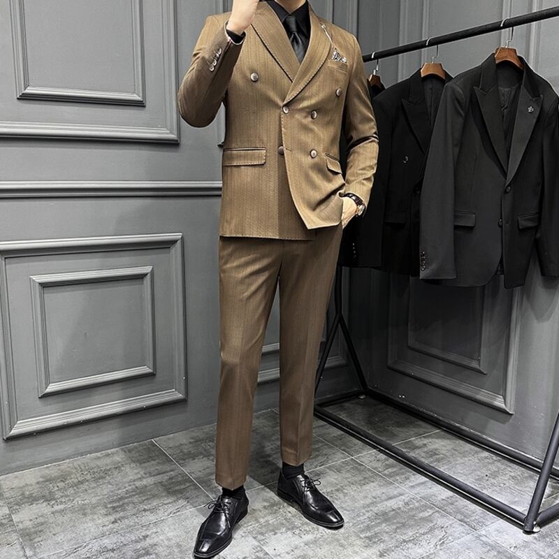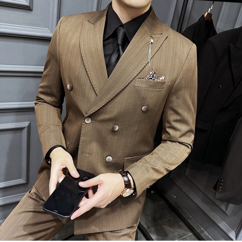 繊細なダーツが美しいシルエットを作る、ダブルブレストのラインパターンスリムフィットスーツ3点セットです。