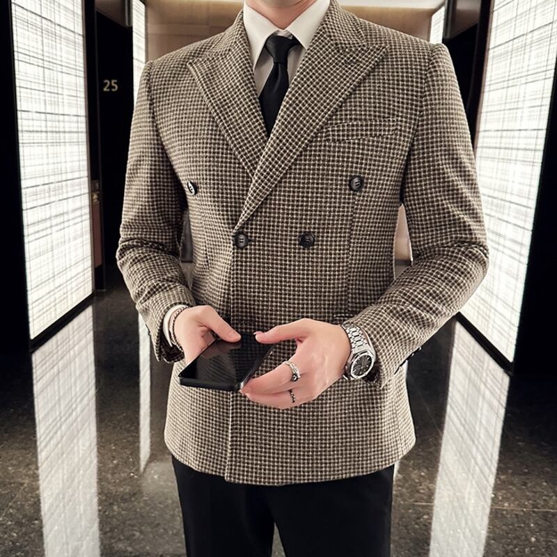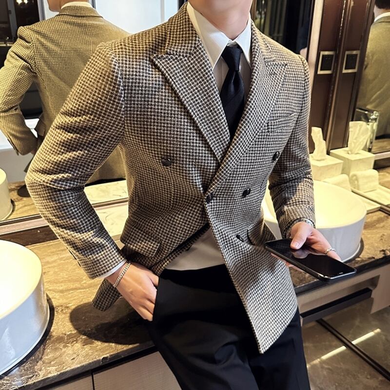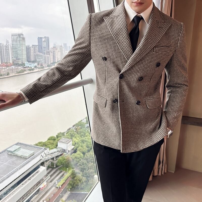繊細なダーツが美しいシルエットを作る、シングルブレストのチェック柄スリムフィットジャケットです。