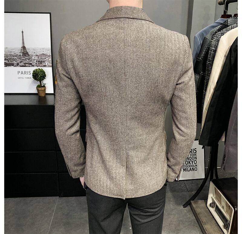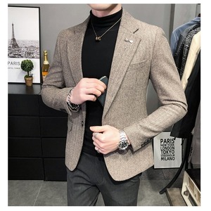 繊細なダーツが美しいシルエットを作る、ヘリンボーンのシングルブレストスリムフィットジャケットです。
