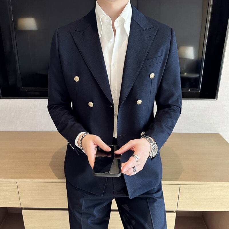 繊細なダーツが美しいシルエットを作る、ダブルブレストのスリムフィットスーツ2点セットです。