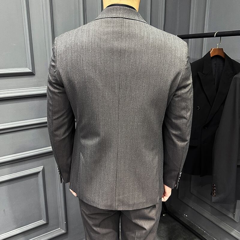 繊細なダーツが美しいシルエットを作る、シングルブレストのスリムフィットストライプスーツ3点セットです。